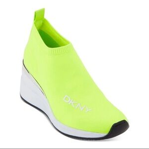 Beautifully bright dkny wedge sneakers jusy a tad small on me. Excellent condition