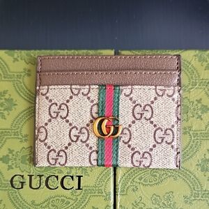 Stylish card holder with signature GG design. Features a red and green stripe with gold logo accent.