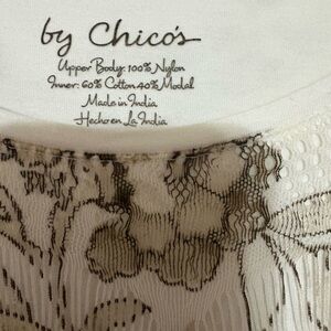 Chico's blouse with intricate lace design. Cream and brown hues. Perfect for elegant occasions.