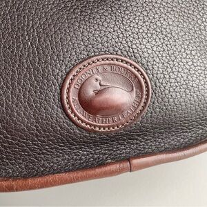 Extremely rare Dooney and Bourke all weather leather crossbody purse, Outback collection in solid dark chocolate with matching chocolate trim, with solid brass hardware toggle , double pocket and interior slip pocket, detachable adjustable crossbody strap.