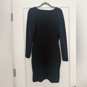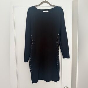 Chic black dress with silver grommet accents. Long sleeves. Perfect for versatile styling.