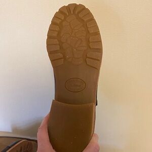Chic black leather flats with adjustable buckle. Comfortable tan soles for everyday wear. Only tried on and never worn outside.