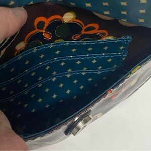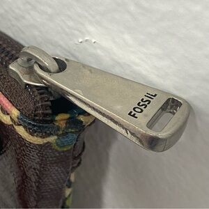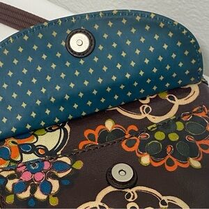 Fossil crossbody bag features a vibrant floral design on a rich brown background. New with no signs of use/never used. Nickel hardware. MSRP $98