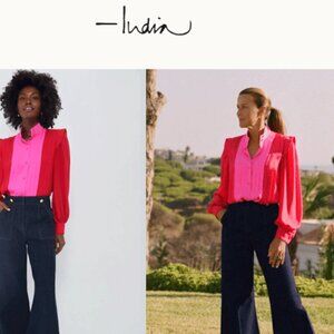 A vibrant red and hot-pink blouse from the India Hicks collaboration with Tuckernuck, designed to capture her bold, colorful aesthetic.