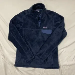 This navy blue Patagonia pullover sized women's MEDIUM is in fantastic condition! It features a front pouch pocket and a small breast pocket. The pullover has snap closures around the neck. This pullover is ready for many years of adventures with you!