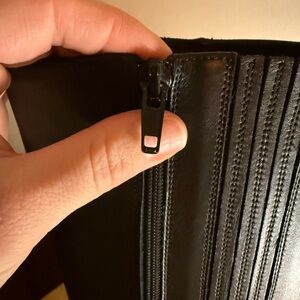 Flaws: some very minor wear around the right base of the heel (pictured) as well as a small chip missing from the zipper pull (also pictured) neither of which effect functionality or are noticeable when worn.