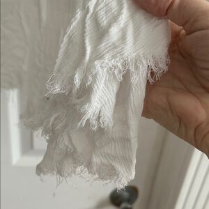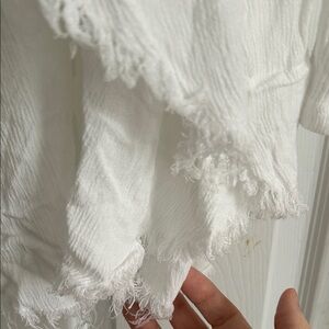 Chic and flowy long sleeve top. Features a scoop neckline and frayed hem. Ideal for casual wear. The front is ribbon and the back is the frayed viscose material. In great shape. A creamy white