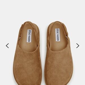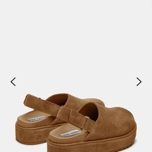 Steve Madden Mellow Cognac Suede mules with a platform sole. Comfortable slingback design. Perfect for casual outings.