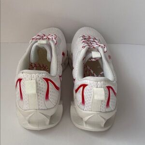 NWOT Stylish white & red “blade” style athletic sneakers used for running, walking or casual wear. Size 8. These shoes are characterized by their distinctive shock-absorbing hollowed-out soles and breathable mesh uppers. Size 8. The “blade” or “crush grid” sole is designed for high shock absorption and a unique visual aesthetic. Smoke and pet free home.