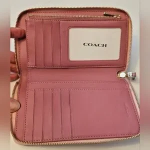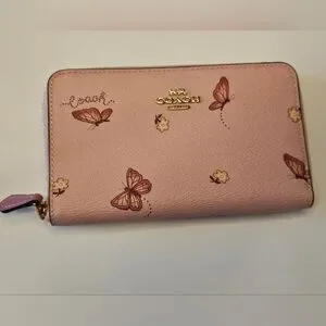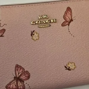Charming pink wallet with butterfly design. Features gold-tone logo. full zip around.