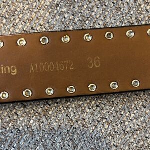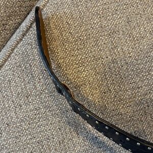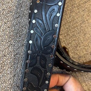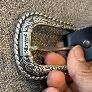 Elegant black leather belt by Ariat. Features a detailed silver buckle. Ideal for stylish outfits. Little beat up edge as seen in pic