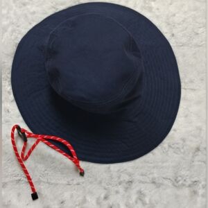 This navy bucket hat with a striking red and white cord is the perfect coastal / nautical addition to your wardrobe this season!