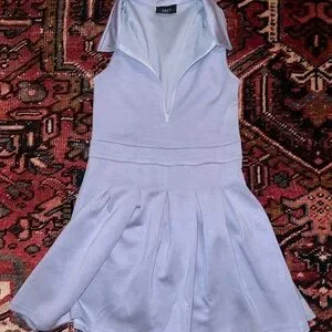 Chic light blue mini dress. Features a collared neckline and pleated skirt. Perfect for casual outings.