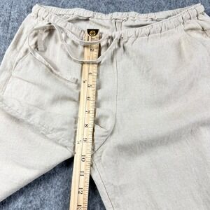 Lightweight linen blend trousers offer a relaxed, breezy fit perfect for warm-weather styling. These wide-leg pants feature a comfortable elastic waistband with an adjustable drawstring and functional side pockets for a practical touch. The neutral beige hue and textured woven fabric provide a versatile base for coastal or minimalist outfits.