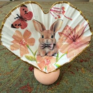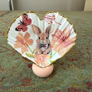 Add charm to your home with this delightful floral bunny decorative shell. Featuring a cute bunny design surrounded by vibrant flowers, this shell is accented with a gold trim for a touch of elegance. Perfect for adding a whimsical touch to any room.
