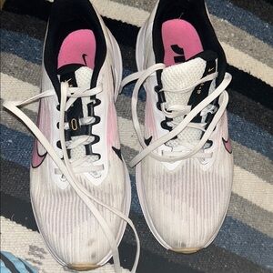 Nike athletic shoes with a white base and pink swoosh. Lightweight and stylish for active wear.