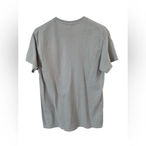 David Bowie “Space Oddity” graphic t-shirt in gray with bold purple, yellow, and orange retro-inspired print.