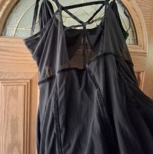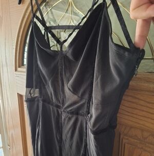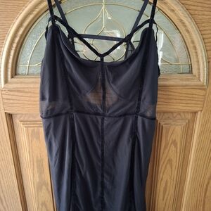 Chic black mini dress with sheer panels. Perfect for a night out. Stylish and bold.