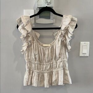The Paloma Top is a flirty ruffled blouse made in a summer-ready sand hued linen. Medium-weight linen is shaped into a gathered bodice with flyaway flutter sleeves. This sweet top has a generous scoop neck and elastic throughout the bodice for a comfortable fit.
