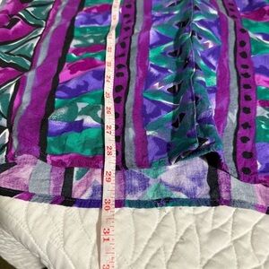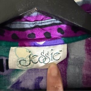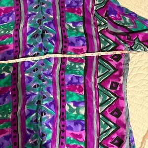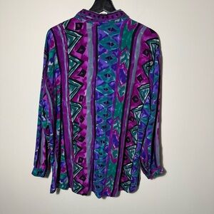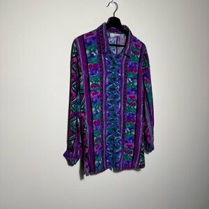 Vibrant button-up shirt with geometric patterns. Features shades of purple, green, and blue. Perfect for a bold look.