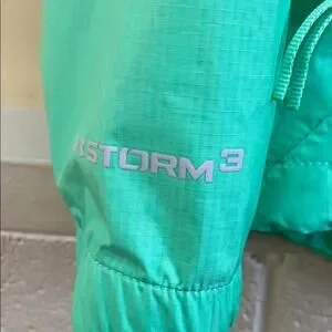 Under Armour L green jacket. Zipper and Velcro closure. Front pockets with zippers. Hooded. Lined. Armpit to armpit measures 22 inches. 29 inches long. Very nice condition.