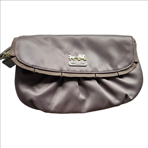 Elegant satin clutch by Coach. Features gold logo and accents. Perfect for stylish evenings.