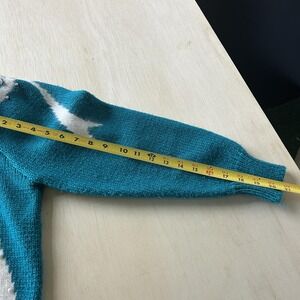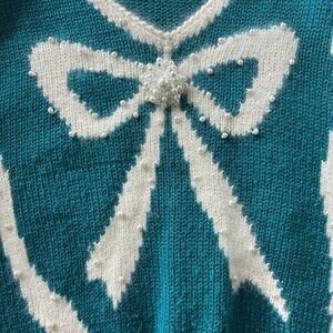 Color/Pattern: Teal blue tight-knit body with contrasting white geometric ribbon pattern and oversized bow graphic on the front and sleeves.