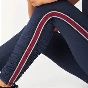 performance Legging with side maroon black silver racer stripe and ruching detail below the knee on ankle.