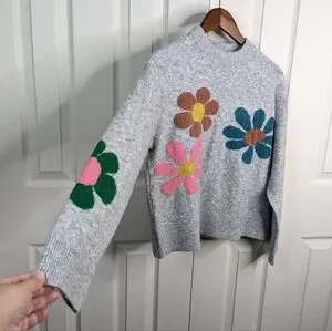 cottagecore daisy floral intarsia knit pop art sweater cozy boxy fit whimsical boho folk charm relaxed silhouette artsy casual playful graphic soft gray palette slow living aesthetic vintage feel cheerful statement knit comfort wear creative layering everyday cozy expressive style feminine casual garden inspired feel-good sweater nostalgic charm pop art