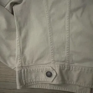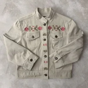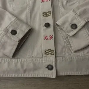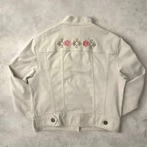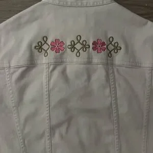 Stylish light tan jean jacket featuring pink floral embroidery.