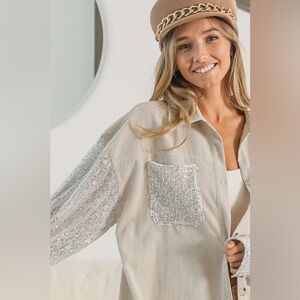 Turn heads in this glam-meets-comfy button-down shirt by BiBi! Featuring a soft beige corduroy body, this long sleeve top is elevated with show-stopping silver sequin details on both sleeves and chest pockets. A perfect mix of cozy and sparkle — ideal for girls’ night out, concerts, or dressing up your everyday denim.