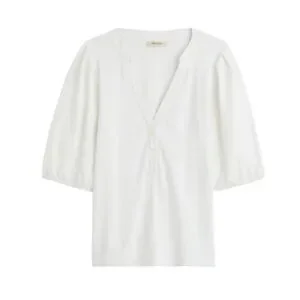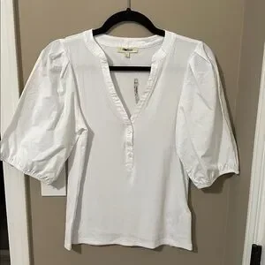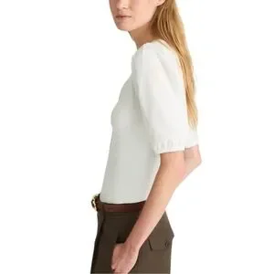 An elevated take on the classic tee, this soft knit top is set apart by a split crew neckline and cotton poplin puff sleeves. Versatile enough to wear from work to the weekend.