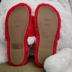 Brand new Francis Valentine red and white faux fur slippers with tan bow strap. Slippers do have sticker residue on bottoms, which I couldn't get off.