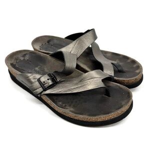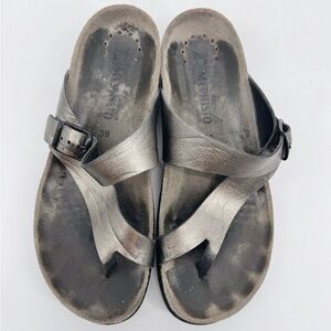 Tags: Mephisto Helen sandal, Mephisto thong sandal, comfort sandal, metallic sandal, cork footbed sandal, size 9 sandal, European comfort shoe, walkable sandal, pewter sandal, silver sandal, orthopedic sandal, summer sandal, EU 39, leather sandal, buckle sandal