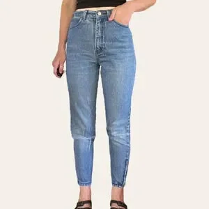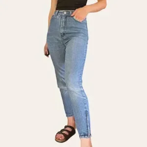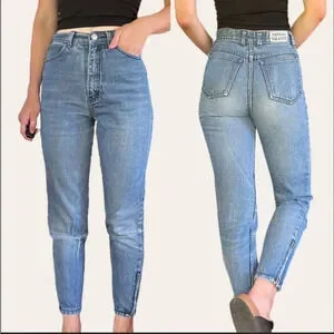 Vintage pinstriped designer jeans by Sergio Valente. A classic wash denim with dark blue pinstripes. High waisted fit with a tapered/skinny leg and zipper details at the ankles. One knee is ripped and the other has some natural distressing/fading to it. Super cute!