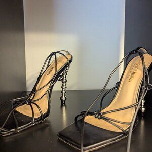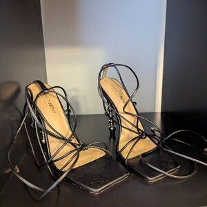 Size 6 1/2 black square toed strappy heels with unique gold heel