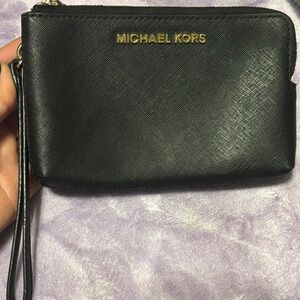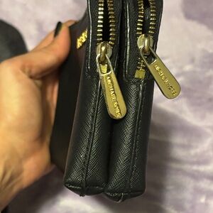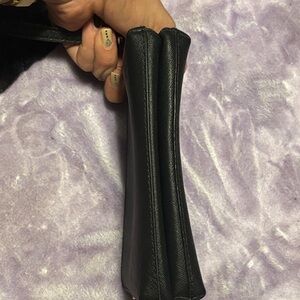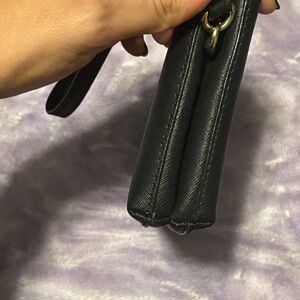Super clean and cute black leather wristlet with gold accents. Features a convenient wrist strap. Only used twice