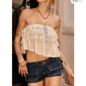 Just as sweet as it is special, this stunning top is featured in a strapless silhouette with lace-adorned, ruffled detailing and floral embroidery at top for the perfect femme finishing touch.