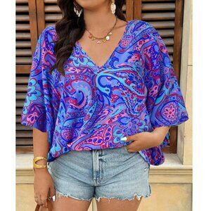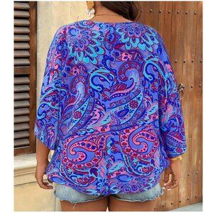 Gorgeous v-neck floral and paisley blouse with a tropical vibe. This top is loose-fitting, comfortable, and will attract unending compliments!