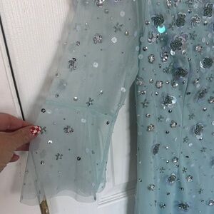 Elegant light blue dress with sparkling embellishments. Features sheer sleeves and a fitted silhouette. Perfect for special occasions.