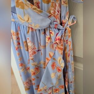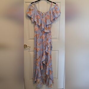 Elevate your style with this stunning high low dress by Blush. Featuring a beautiful pastel blue color adorned with floral patterns, it's perfect for any elegant occasion.