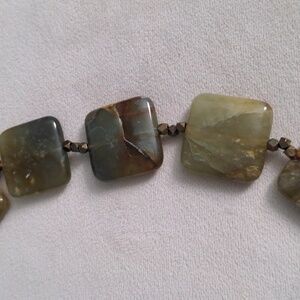 This elegant necklace features a gorgeous array of multi-color Agate gemstones An eye-catching blend of color, naturally patterned in various shades of green, gold and brown. Smooth with a high polish, each stone is unique, one of a kind. Translucent. Cleopatra collar style.