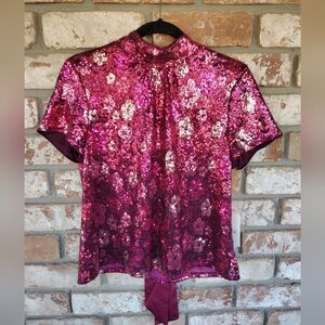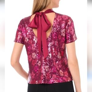 CeCe NWT Mock Neck Sequin Floral Tie Scoop Back Top M Party Evening Glamoratti