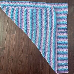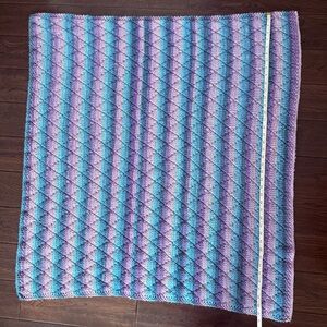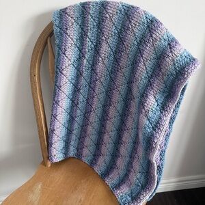 Cozy hand-knit blanket with colorful purple and blue hue stripes. Lovingly hand knit and gift-able. Perfect for adding a pop of color to any new baby’s room, stroller or use as a winter car seat cover.
