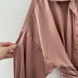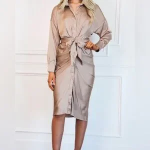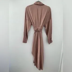 Sophisticated long sleeve dress with a front tie detail. Ideal for formal events. Missing a button under the sash.