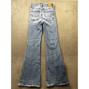 Get ready to rock your style with these fantastic American Eagle Wide Flare Jeans! These high-rise jeans are designed for comfort and a flattering fit, featuring a touch of stretch that moves with you throughout your day. The on-trend wide flare leg adds a vintage-inspired touch, perfect for pairing with your favorite boots or platform heels. These jeans come with a stylish distressed finish, giving them that effortlessly cool, lived-in look you'll absolutely love. They are a women's size 00, offering a perfect blend of style and ease. Whether you're heading out for a casual day with friends or looking to elevate your everyday ensemble, these American Eagle jeans are a superb choice. They are in excellent pre-owned condition and ready to become a staple in your wardrobe. Don't miss out on adding this versatile and chic piece to your collection!