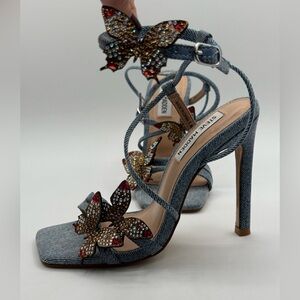 Steve Madden Denim Butterfly Rhinestone Stiletto Heels – Embellished Ankle Strap Designer Sandals Size 5.5