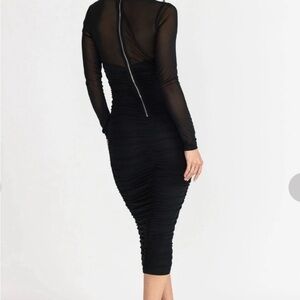 Chic black midi dress with stylish cutout design. Features sheer long sleeves and a form-fitting silhouette.