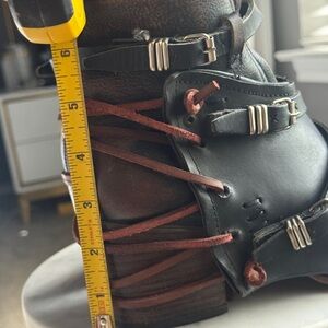Edgy black and brown boots with buckle details. Perfect for a bold look.