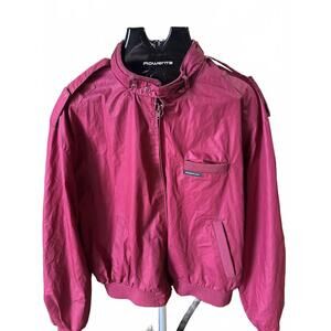 Classic Vintage Members Only jacket in deep red. Size 46. Made in Korea. Shell 65% polyester / 35% cotton, nylon lining. Signature shoulder epaulets, stand collar with throat latch, zip front, ribbed cuffs and hem. Measures 25" pit to pit, 18" shoulders, 24" length, 25.5" sleeves. Strong late 80s–early 90s piece.